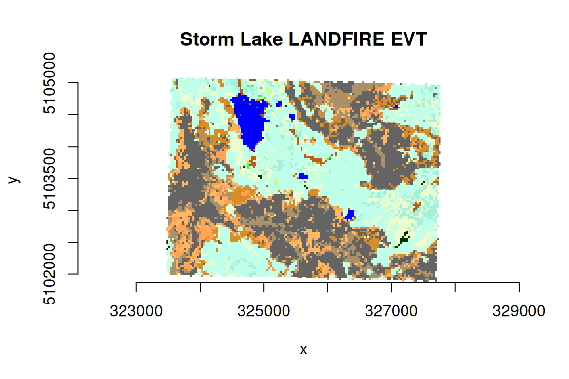 displayRAT(tbl, title = "Raster Attribute Table for Storm Lake EVT")| Raster Attribute Table for Storm Lake EVT | ||||||||