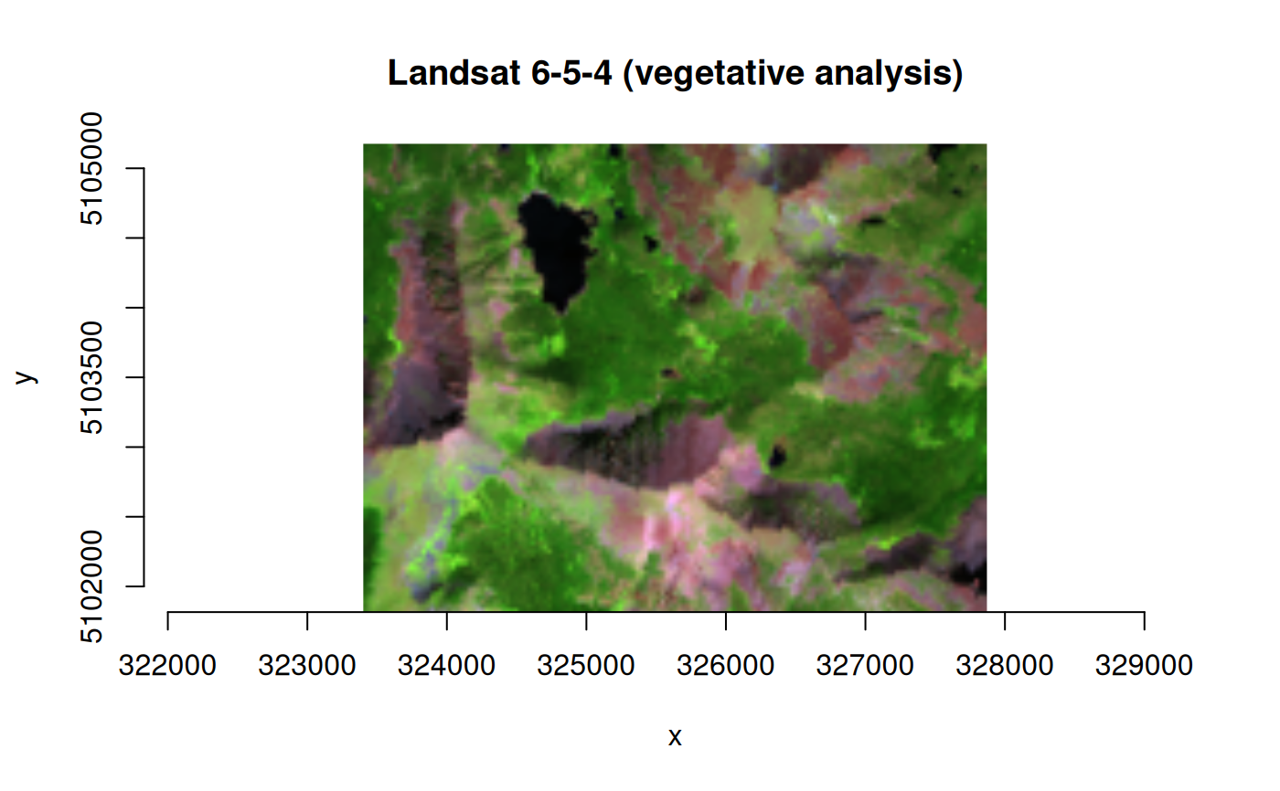 plot_raster(ds, nbands = 3, main = "Landsat 6-5-4 (vegetative analysis)")