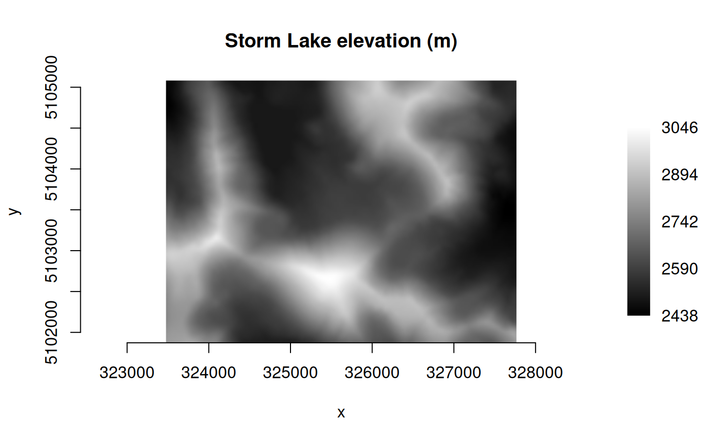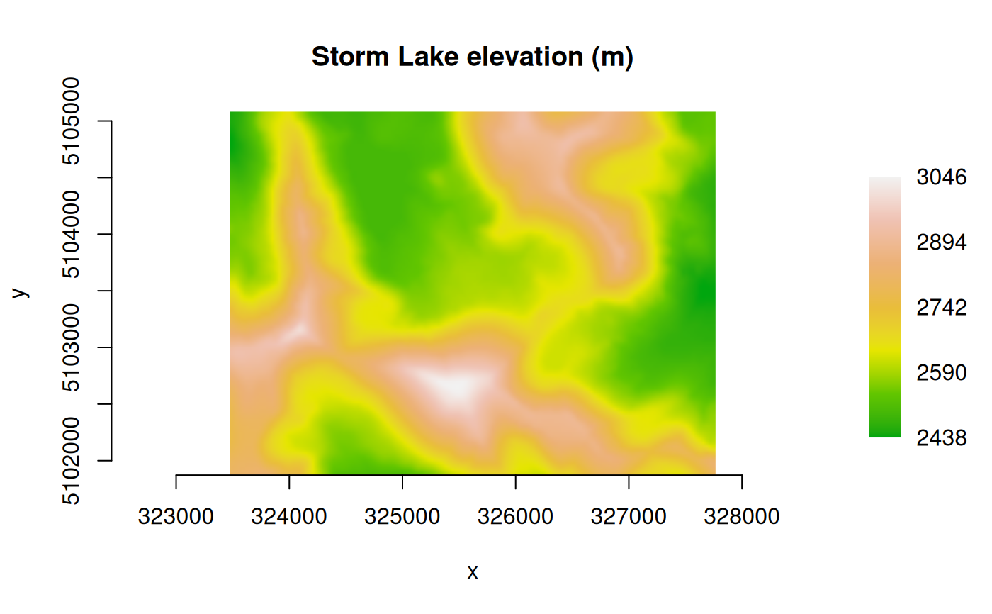 plot_raster(ds, legend = TRUE, main = "Storm Lake elevation (m)")