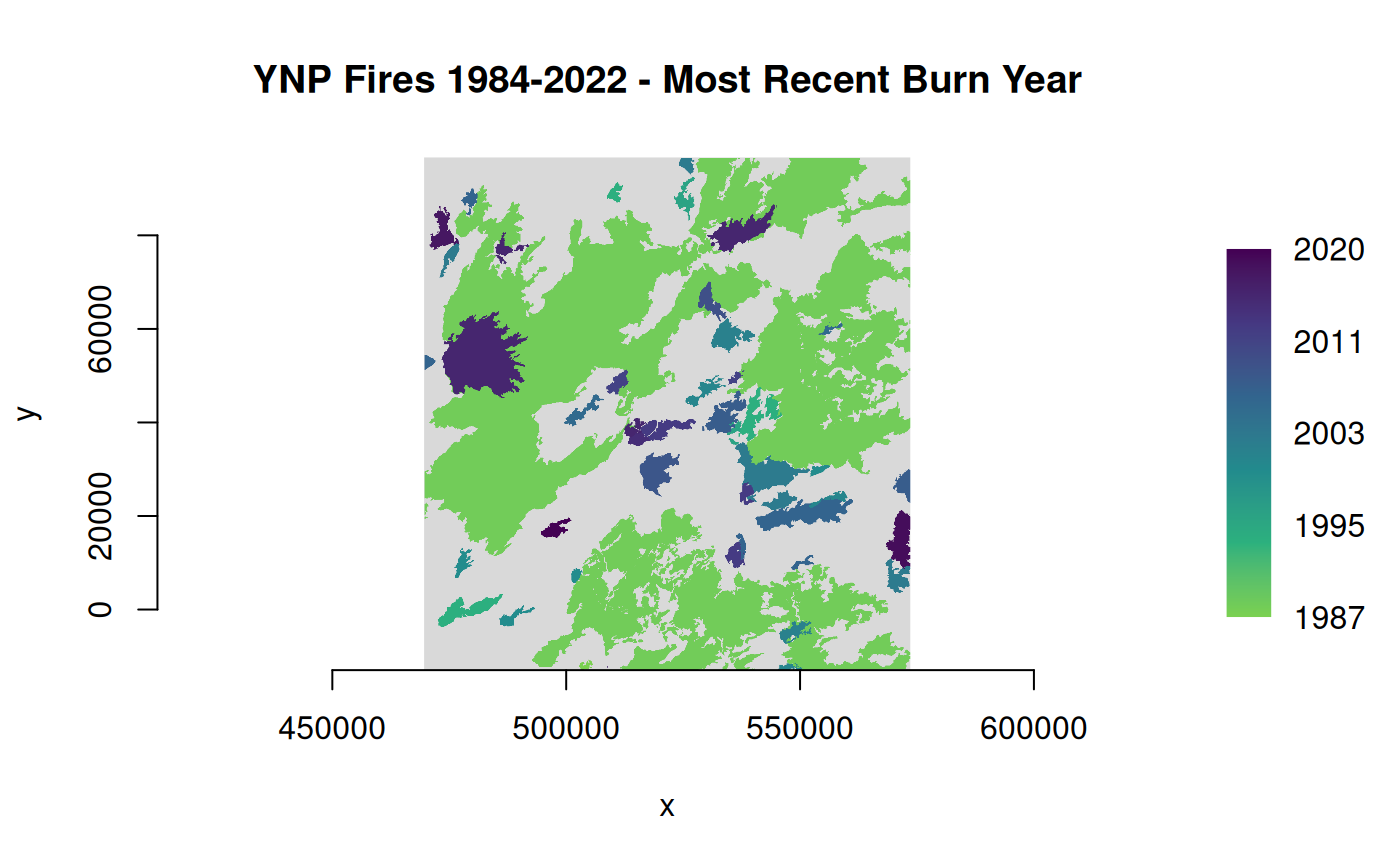main = "YNP Fires 1984-2022 - Most Recent Burn Year")